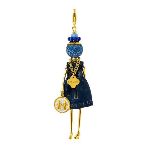 Con un vestido azul medianoche adornado con detalles dorados y un charm del zodíaco, es la pieza perfecta para quienes aman expresar ligereza y versatilidad en cada detalle.