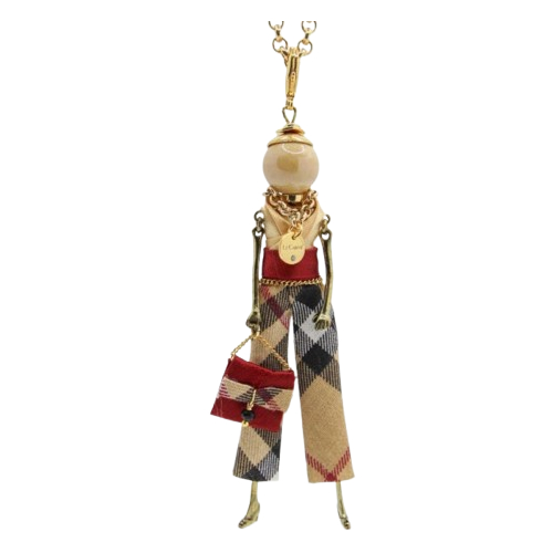Carosa lleva unos pantalones con estampado de cuadros escoceses en tonos beige, rojo y negro, combinados con un pequeño bolso a juego, todo ello elaborado artesanalmente.