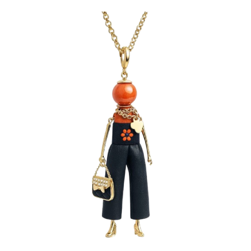 La muñeca lleva una blusa naranja brillante y pantalones negros decorados con apliques florales multicolores que le dan un toque divertido y refinado. Lleva un pequeño bolso rojo a juego con la blusa para un look femenino y elegante. Un accesorio perfecto para quienes disfrutan de añadir un toque artístico a su atuendo