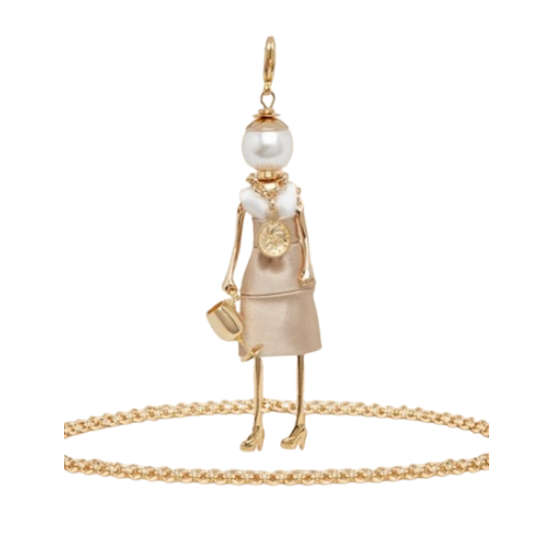 Está compuesta por una cadena dorada, con un colgante trabajado está hecha a mano, con un vestido de tela entallado y pequeños detalles en dorado con relieve.